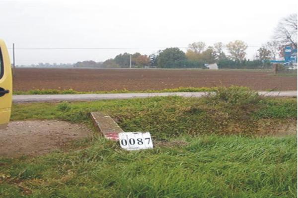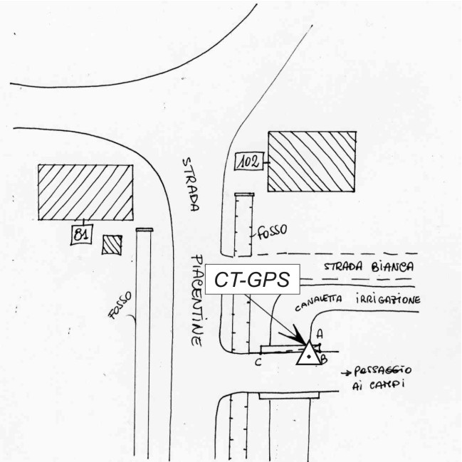 | materializzazione | Centrino metallico infisso sul cordolo in cemento armato del ponticello di entrata ai campi, posto in Strada Piacentine dopo il civico 102. A=0,16 B=0,16 C=2,83 |