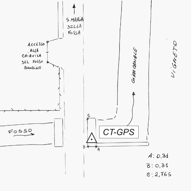 | materializzazione | Centrino metallico infisso sul cordolo del ponticello situato nei pressi della chiavica del Fosso Bondino in Località Santa Maria della Fossa. |