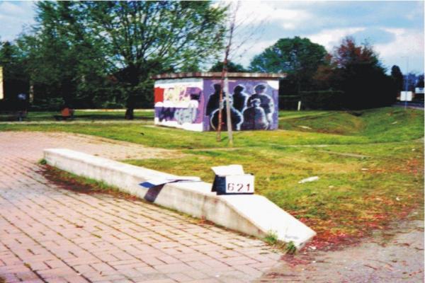 | materializzazione | Centrino metallico infisso sul cordolo del piccolo ponte situato all'interno del giardino pubblico, a fianco della tangenziale di Correggio, nei pressi di una cabina ENEL. |