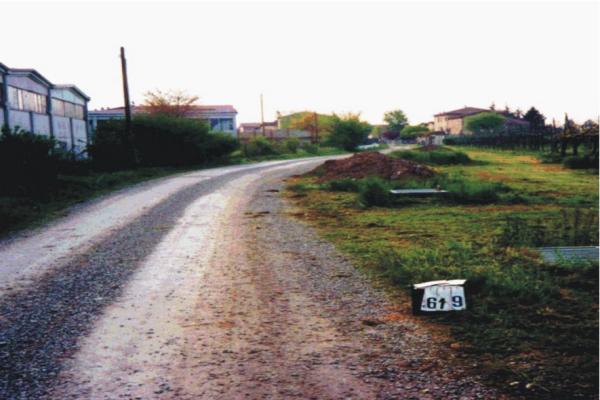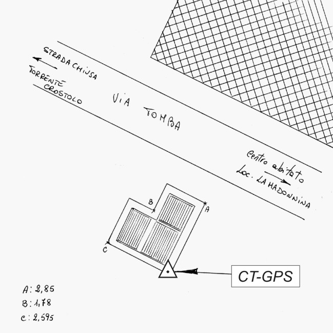 | materializzazione | Centrino metallico infisso sul cordolo della chiusa situata in Via Tomba, Località La Madonnina, nei pressi del retro di un capannone. |