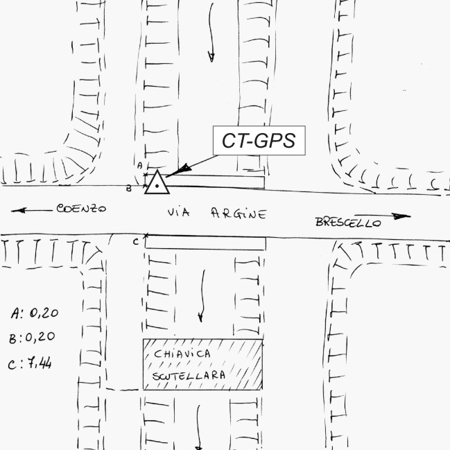 | materializzazione | Centrino metallico infisso sul cordolo del ponte di Via Argine sul canalazzo di Bentivoglio, nei pressi della chiavica Scutellara. |