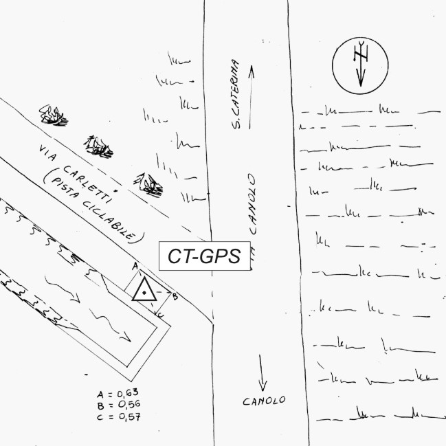 | materializzazione | Centrino metallico infisso sul basamento in cemento della chiusa situata all'incrocio della strada pedonale Via Carletti con Via Canolo in località Canolo. |