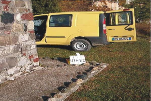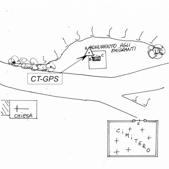 | materializzazione | Centrino metallico infisso sullo spigolo del basamento del monumento agli immigrati posto di fronte al cimitero di Boccolo dè Tassi in località Case Paglini. |