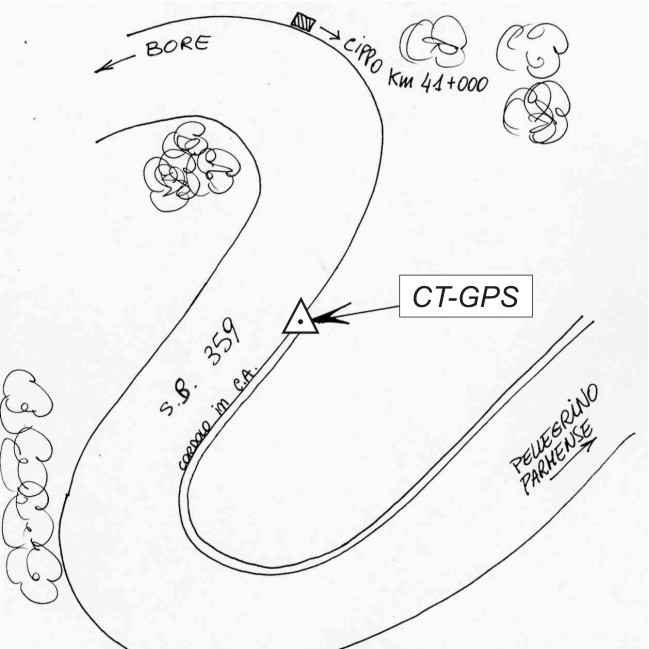 | materializzazione | Centrino metallico infisso sulla sommità della fine del cordolo in cemento armato posto lungo la S.P. 359, circa all'altezza del cippo del km 41+00. |