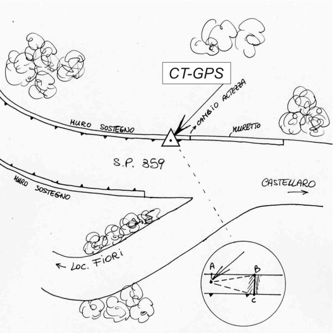 | materializzazione | Centrino metallico infisso sulla sommità del muro di sostegno (parte più alta) posto lungo la S.P. 359 in Località Castellaro, di fronte al bivio per Località Fiore. |