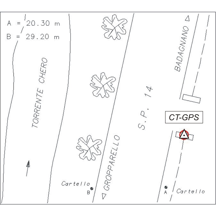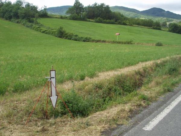 | materializzazione | Centrino metallico infisso su tombino in cemento, il più a sud dei due, all'ingresso di un campo presso il bordo est della S.P. 14. |