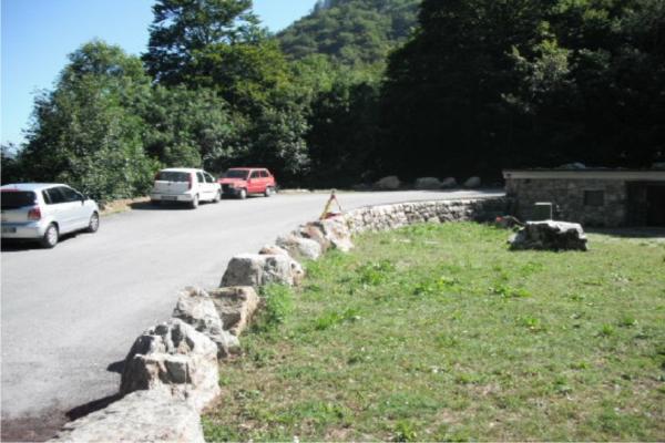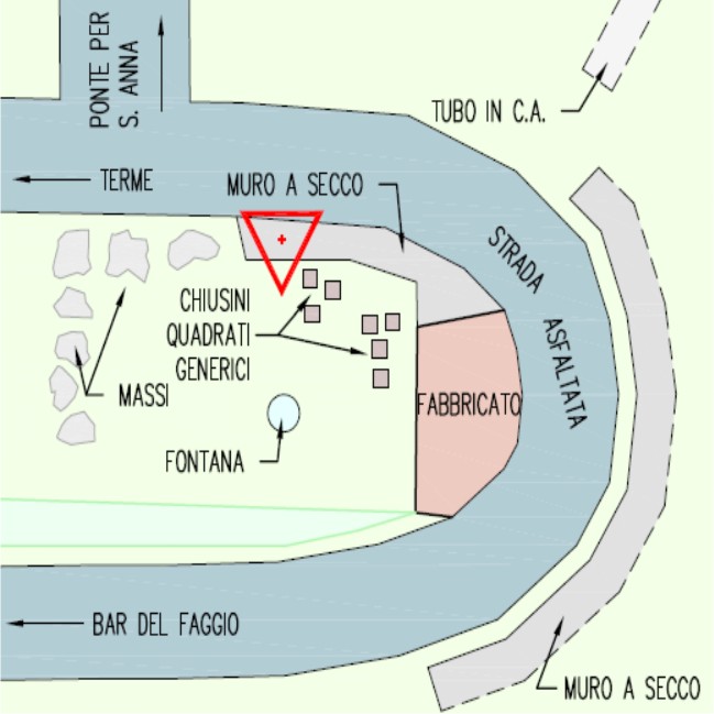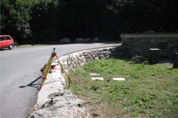 Centrino metallico della Regione Piemonte infisso sul muro di sostegno della strada, all'interno della curva.