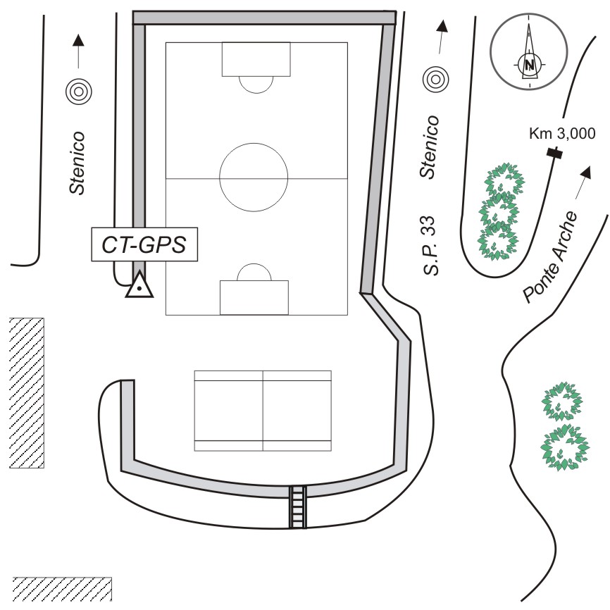 Centrino in acciaio inox del tipo "GPS C" infisso sulla sommità del muro di contenimento a protezione del campo di calcio, in prossimità della testata adiacente all'accesso dell'impianto sportivo.