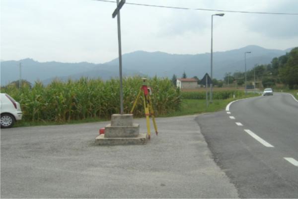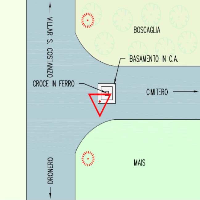 | materializzazione | Centrino metallico del Ministero delle Finanze – Catasto di Cuneo infisso sul piedistallo in cemento armato della croce, vicino al cimitero. |