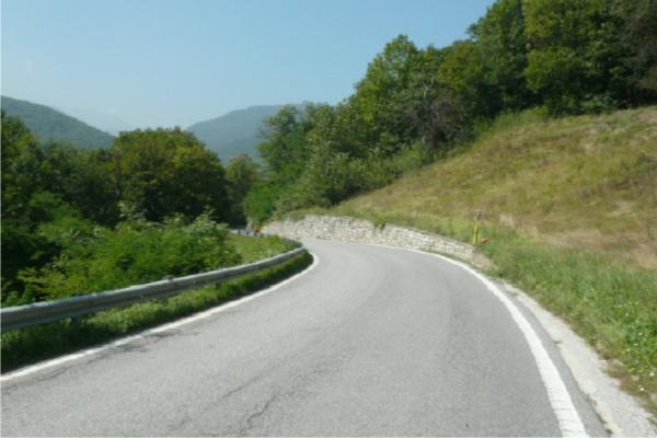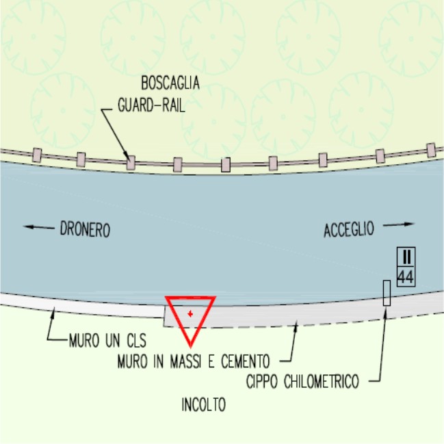 | materializzazione | Centrino metallico della Regione Piemeonte infisso su un muro in cemento armato sul lato destro della strada. |