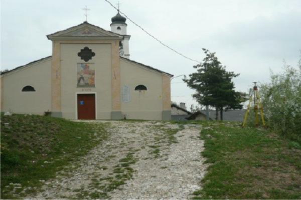 | materializzazione | Centrino metallico della Regione Piemonte infisso sul muro di sostegno del piazzale sterrato della chiesa. |