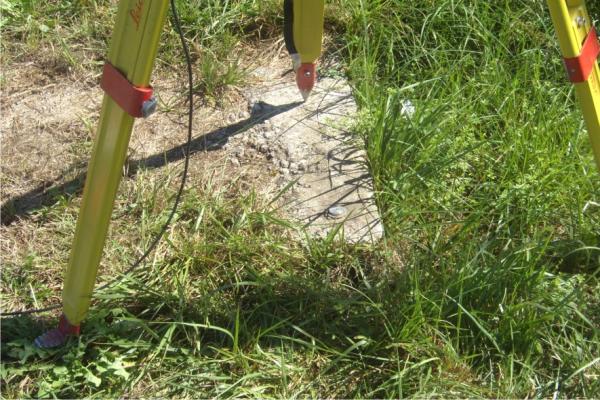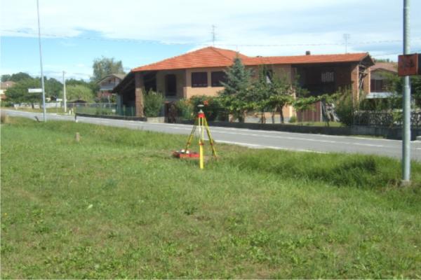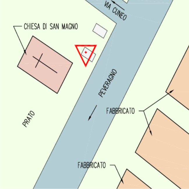 Centrino metallico del Ministero delle Finanze – Catasto di Cuneo infisso su un manufatto in cemento armato sul lato destro della strada.