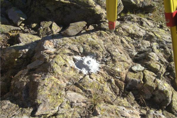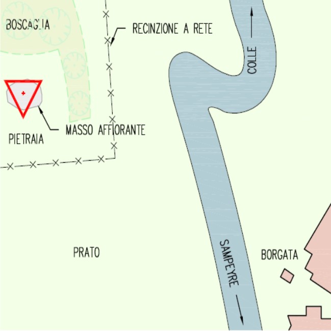 | materializzazione | Centrino metallico della Regione Piemonte infisso su una roccia affiorante sulla sinistra della strada, vicino al tornante. |