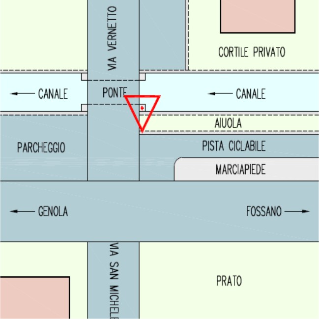 | materializzazione | Centrino metallico del Ministero delle Finanze – Catasto di Cuneo infisso sulla spalla destra del ponticello all'inizio di Via Vernetto. |