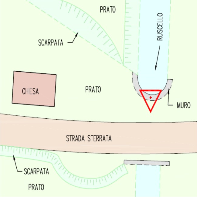 | materializzazione | Centrino metallico della Regione Piemonte murato sulla soletta di un attraversamento a destra della strada, poco prima della chiesa. |