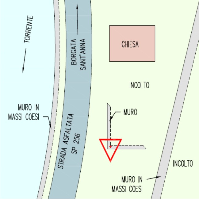 | materializzazione | Centrino metallico della Regione Piemonte infisso su muretto di sostegno del parcheggio. |