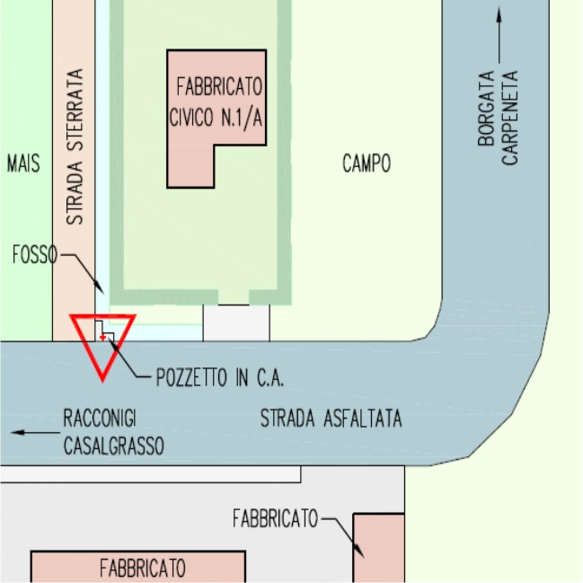 | materializzazione | Centrino metallico del Ministero delle Finanze – Catasto di Cuneo infisso su un manufatto in cemento, davanti al civico 1/A. |