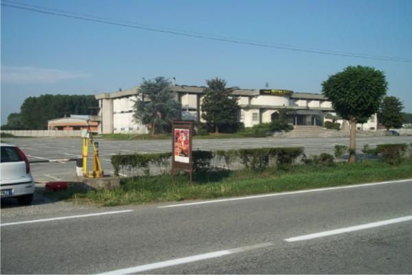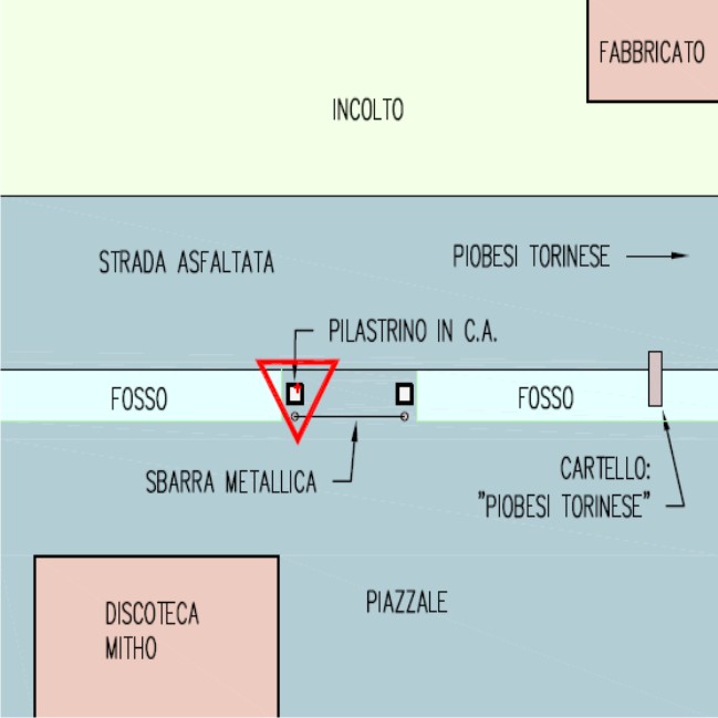 | materializzazione | Centrino metallico della Regione Piemonte infisso su un pilastrino in cemento davanti al parcheggio della discoteca. |