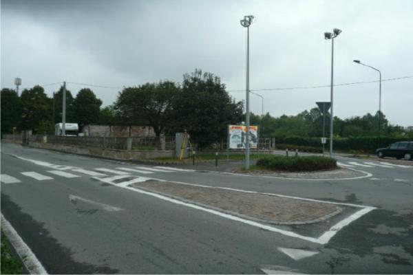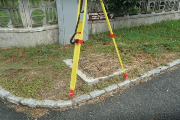 | materializzazione | Centrino metallico della Regione Piemonte murato sul basamento del chiusino della Telecom, nell'aiuola della rotonda. |
