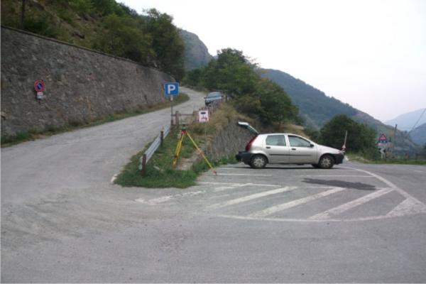 Centrino metallico della Regione Piemonte infisso su un muro di sostegno della strada prima di entrare nella borgata.