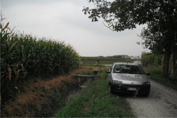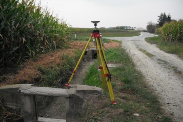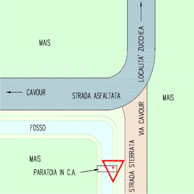 Centrino metallico del Ministero delle Finanze – Catasto di Torino murato su una chiusa in cemento armato nei pressi di una curva.