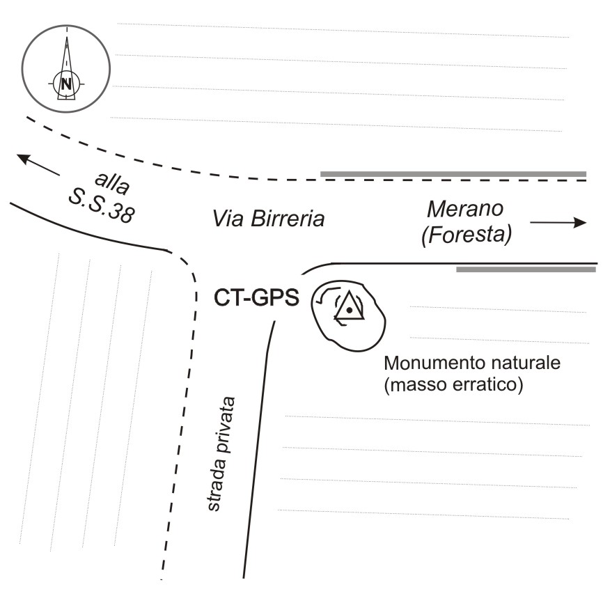 | materializzazione | Centrino universale inox infisso sulla sommità di un grande masso in pietra, dichiarato "Monumento Naturale", all'incrocio tra via Birreria e la strada privata che porta alla statale. |