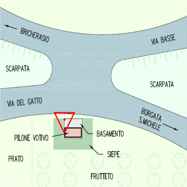 | materializzazione | Centrino metallico del Ministero delle Finanze – Catasto di Torino murato sul basamento di un tabernacolo posto sull'incrocio. |