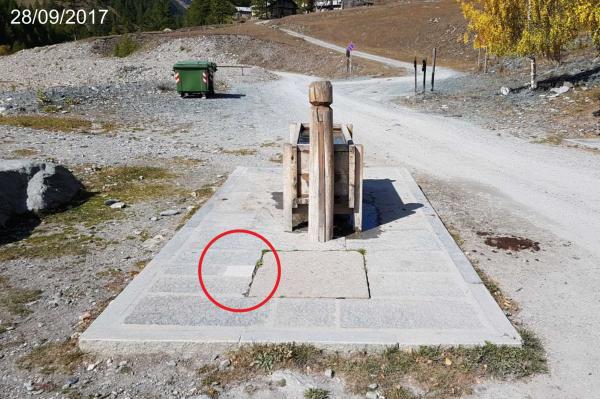 Centrino metallico della Regione Piemonte murato su basamento in cemento della fontana davanti all'ufficio informazioni del Parco Val Troncea.