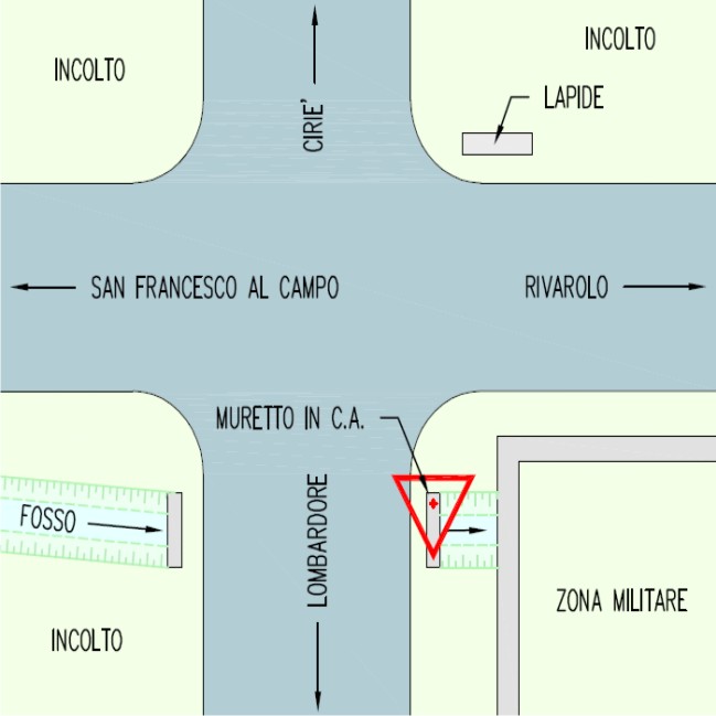 | materializzazione | Centrino metallico del Ministero delle Finanze – Catasto di Torino infisso su un muretto in cemento armato in prossimità dell'incrocio con Via Lombardore. |