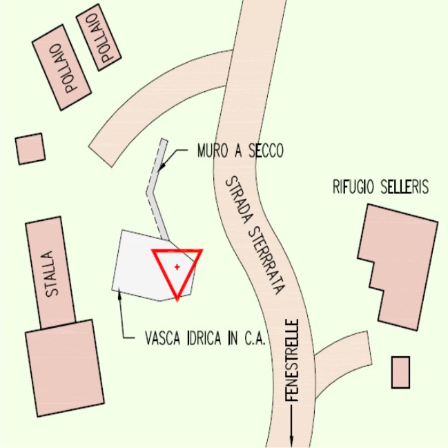 | materializzazione | Centrino metallico della Regione Piemonte murato su una vasca idrica in cemento armato sulla sinistra della strada sterrata nei pressi del rifugio. |