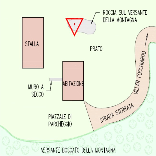 | materializzazione | Centrino metallico della Regione Piemonte infisso su una roccia affiorante nel prato dietro i fabbricati. |