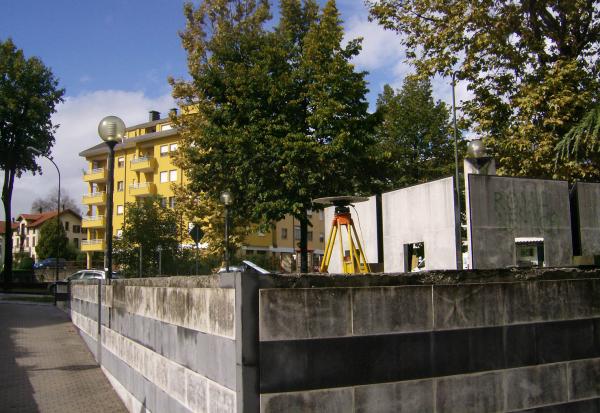 | materializzazione | Centrino universale infisso al centro del rivestimento a motivo in marmo a m 1,50 dalla cuspide del parapetto della piazza Alessandro De Luca, posteriormente al monumento ai caduti prospicente la strada. |