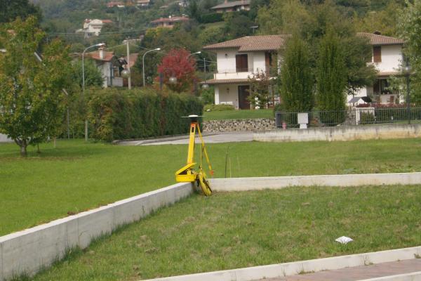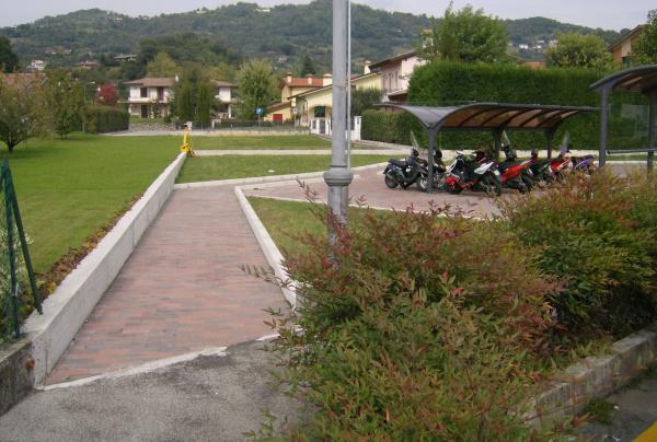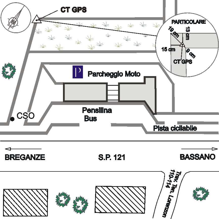 Centrino universale infisso sulla sommità di un cordolo in cemento che delimita un'area adibita ad aiuole parcheggio per moto e fermata dell'autobus, presso lo spigolo piu' a nord-ovest, lato opposto alla strada.