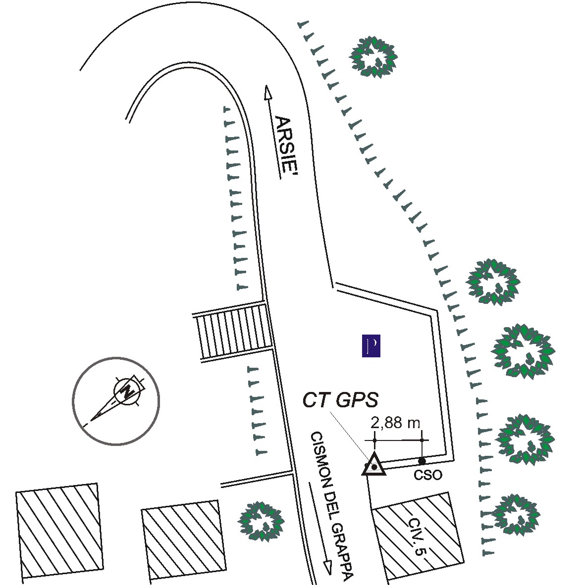 | materializzazione | Contrassegno orizzontale anonimo, infisso all'estremità del muro lato strada, a circa 2,88 m dal centrino universale IGM, lato ovest dell'area di sosta per pulman. |