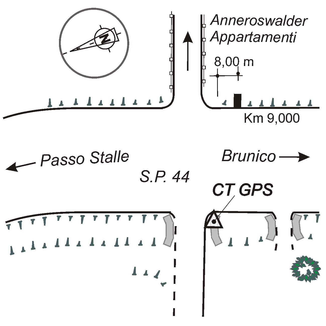 | materializzazione | Contrassegno orizzontale del Catasto (punto fiduciale), infisso sulla sommità del tombino in pietra naturale, lato opposto della strada rispetto al cartello del Km 9 della S.P. 44. |