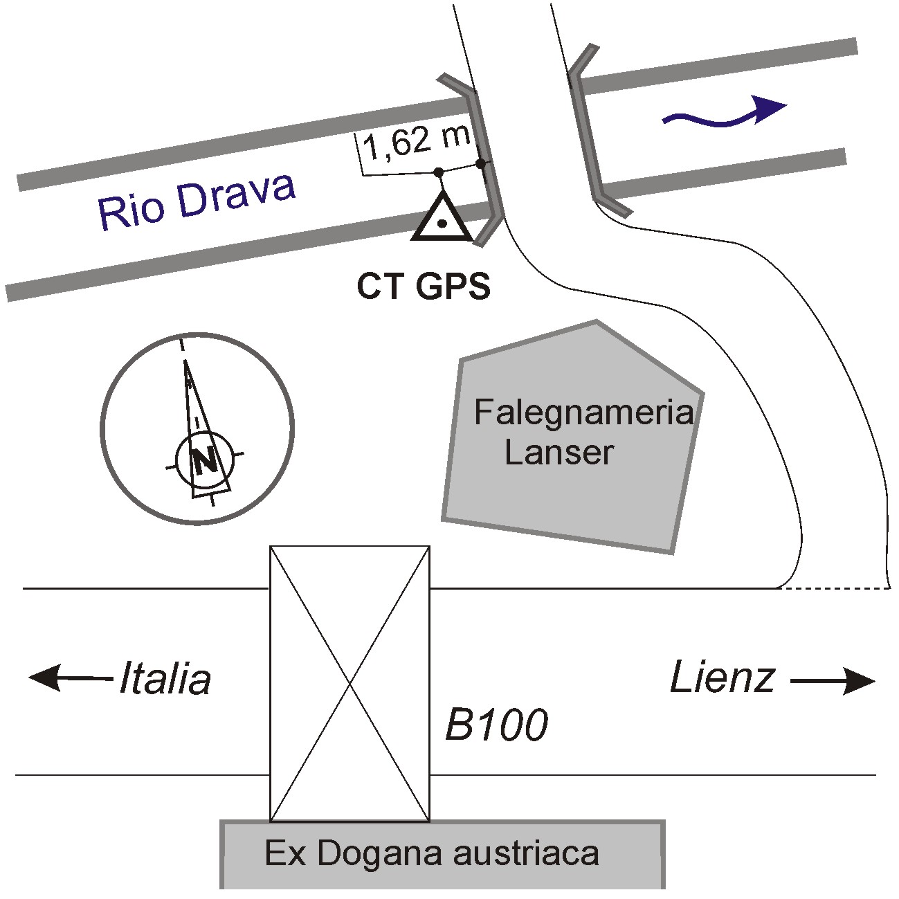 | materializzazione | Chiodo orizzontale austriaco con foro (coincide con il punto P49837B), infisso sul muro a monte del ponte che attraversa il Rio Drava, in riva destra a circa 1,62 m dalla spalletta. |