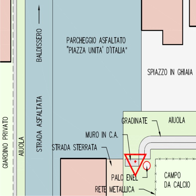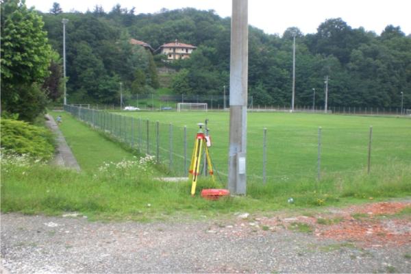 | materializzazione | Centrino metallico della Regione Piemonte infisso su un muretto in cemento vicino alle gradinate di un campo da calcio. |
