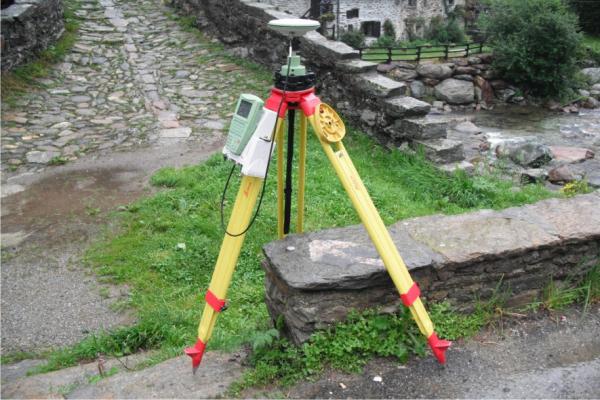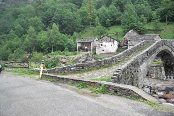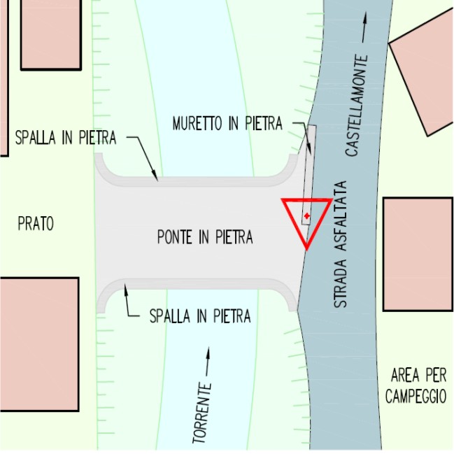 Centrino metallico del Ministero delle Finanze-Catasto di Torino infisso su muro davanti a un ponte in pietra.