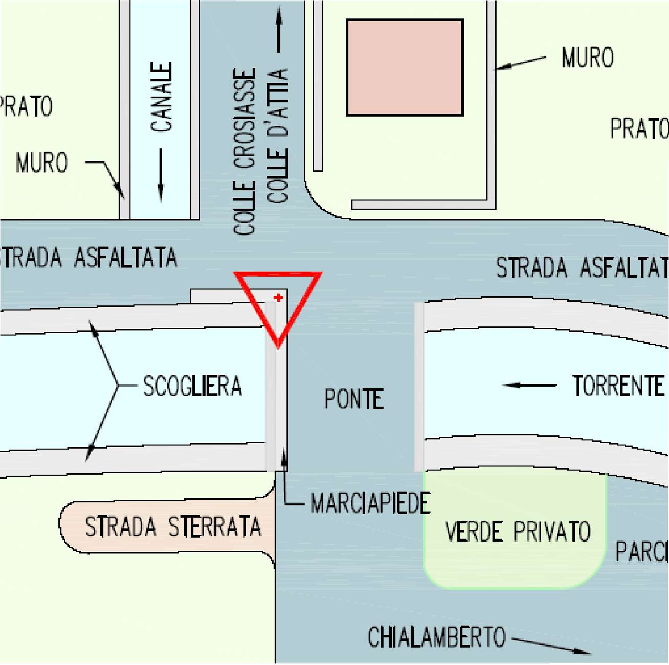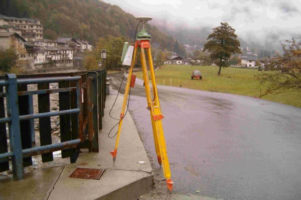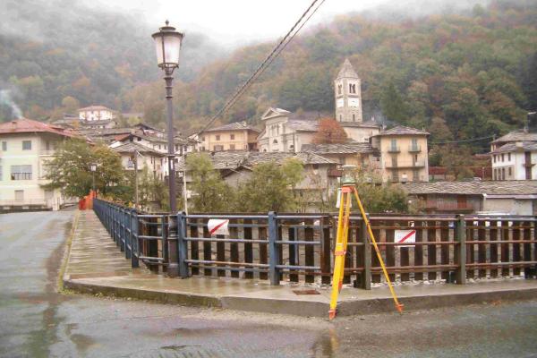 | materializzazione | Centrino metallico della Regione Piemonte murato su un marciapiede, in cemento armato, vicino al ponte. |