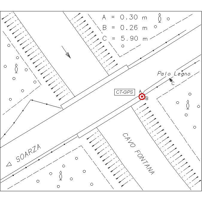 | materializzazione | Centrino metallico infisso sullo spigolo sud-est della spalletta in cemento del nuovo ponte sul Cavo Fontana a 200 metri circa dal centro di Soarza. |