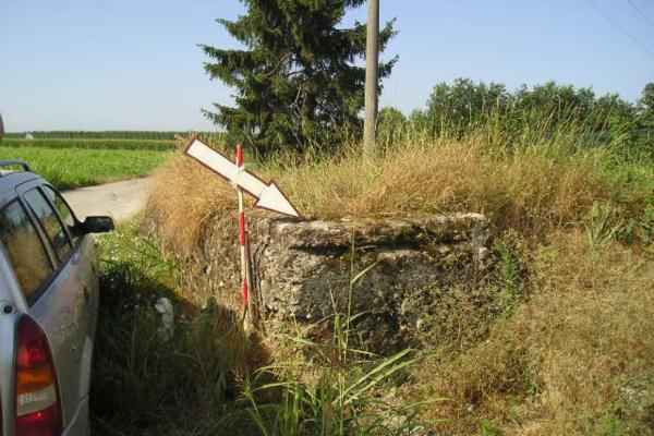 | materializzazione | Centrino metallico infisso sullo spigolo nord-est di una vecchia rampa in cemento all'ingresso dell'Azienda Faunistica "Pioppaia". |