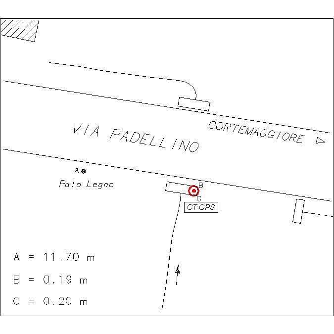 | materializzazione | Centrino metallico infisso sulla copertina in cemento all'estremità est di una grossa chiavica ed in prossimità del bordo sud di Via Padellino. |