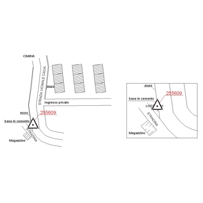 | materializzazione | Centrino metallico infisso su cordolo in calcestruzzo a bordo della Strada Vicinale Cacia/Addolorata. |