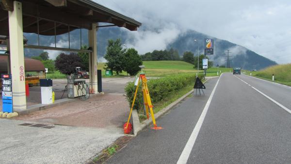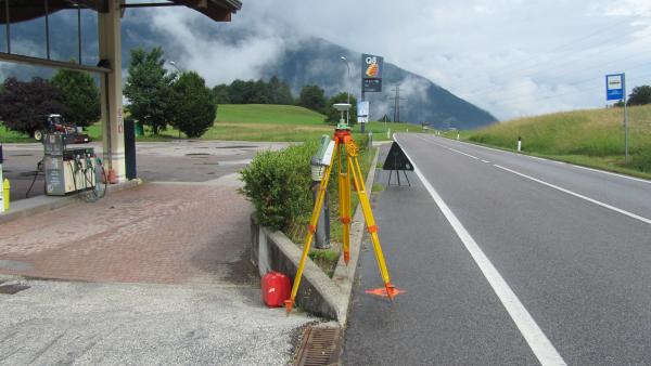 | materializzazione | Centrino in ghisa del Catasto di Trento, posto sul muretto di delimitazione tra il distributore di carburante e la statale. |