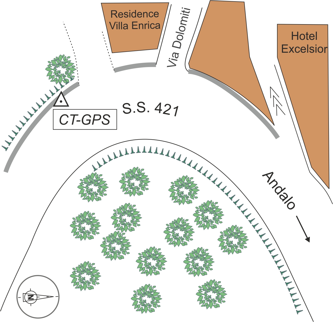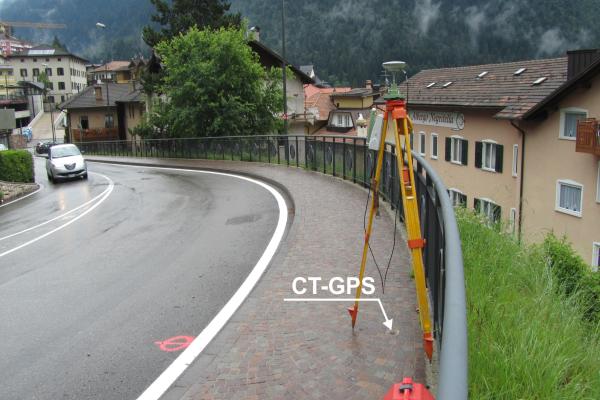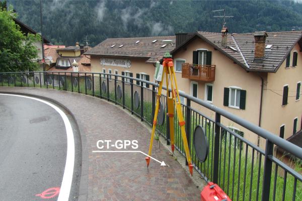 Centrino in ghisa del Catasto di Trento cementato nella pavimentazione in porfido del marciapiede a ridosso del parapetto in ferro, a valle del tornante.
