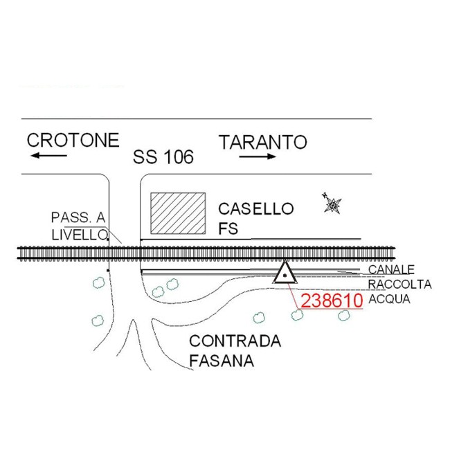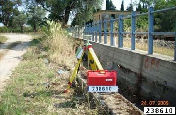| materializzazione | Centrino metallico infisso su testa di muro in calcestrusso del canale di raccolta delle acque, adiacente a muro di contenimento della ferrovia. |