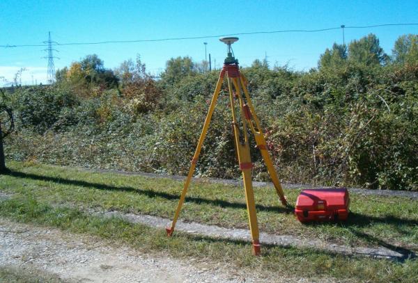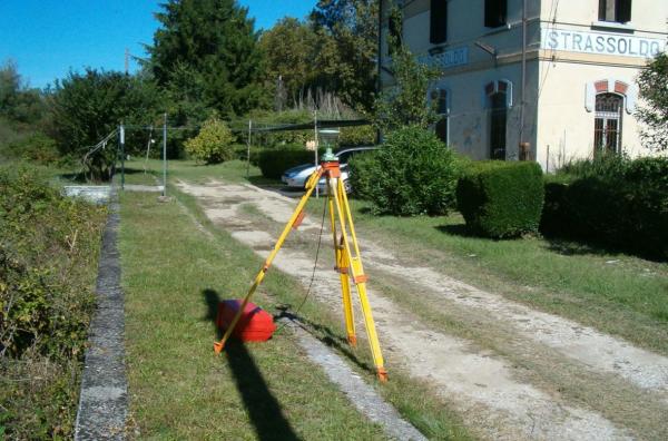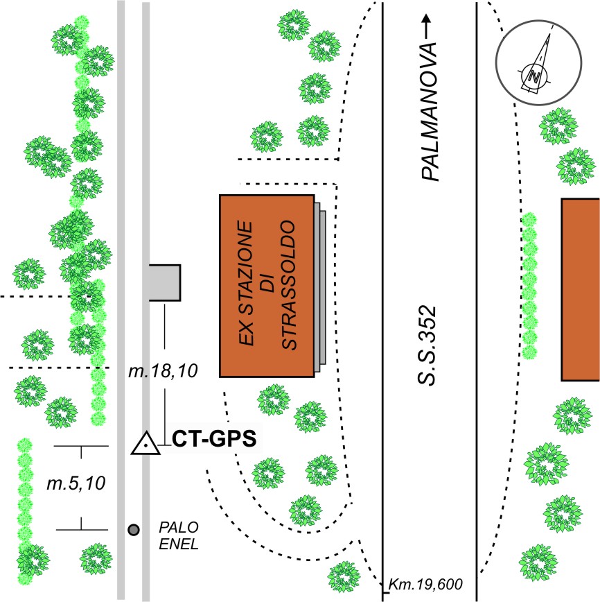 | materializzazione | Centrino in acciaio inox del tipo "GPS C" infisso sul basamento in cemento della vecchia linea ferroviari, prospicente la ex Stazione di Strassoldo posto alla distanza di 18,10 metri dalla piattaforma di accesso all'ex binario e a 5,10 metri dal palo dismesso dell'ENEL. |