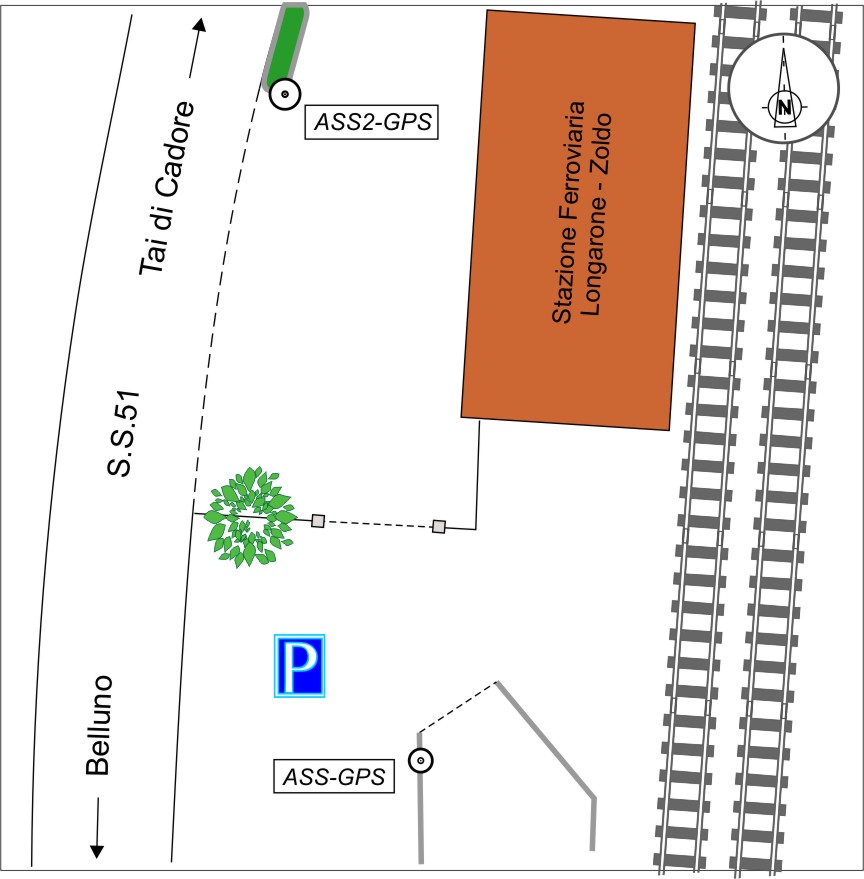 | materializzazione | Centrino metallico piatto della rete GPS dell'ANAS n.0691, infisso sul cordolo dell'aiuola che delimita la strada con l'accesso alla stazione Ferroviaria di Longarone. |
