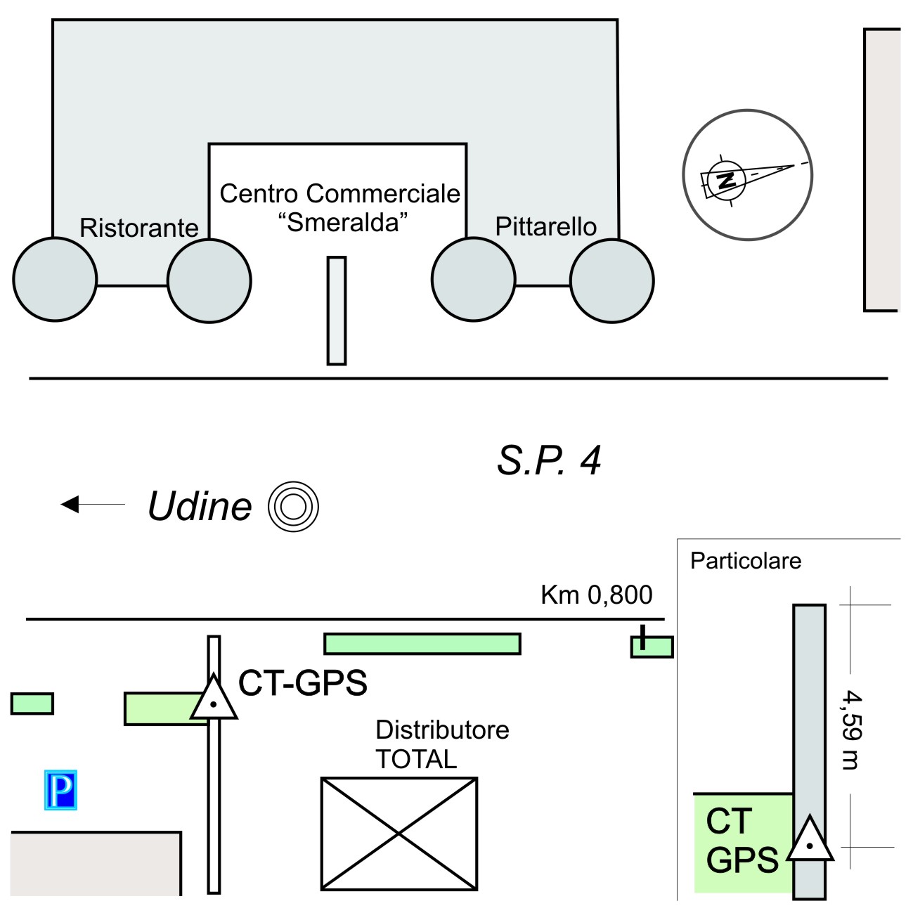 Centrino IGM95 del tipo "GPS C" infisso sulla sommità del muretto in c.a. divisorio fra il distributore TOTAL ed il parcheggio del Centro Commerciale successivo, in direzione di Udine, sulla sinistra della S.S. 13, a 4,59 m dall'estremità lato strada.