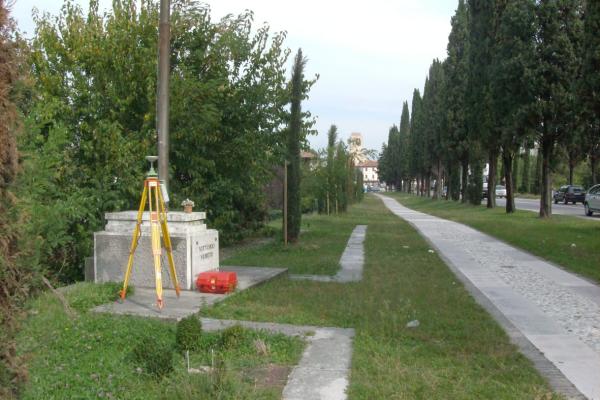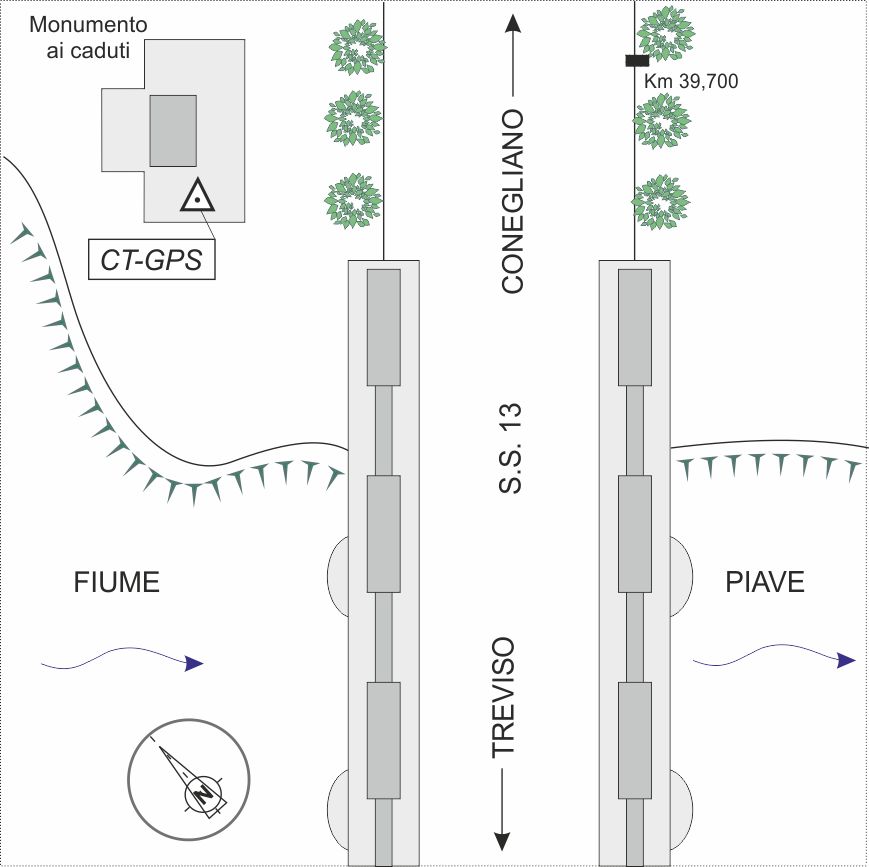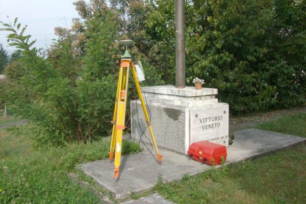 Centrino anonimo del tipo da livellazione infisso sul basamento in cemento del monumento ai caduti edificato in prossimità del ponte sul fiume Piave.